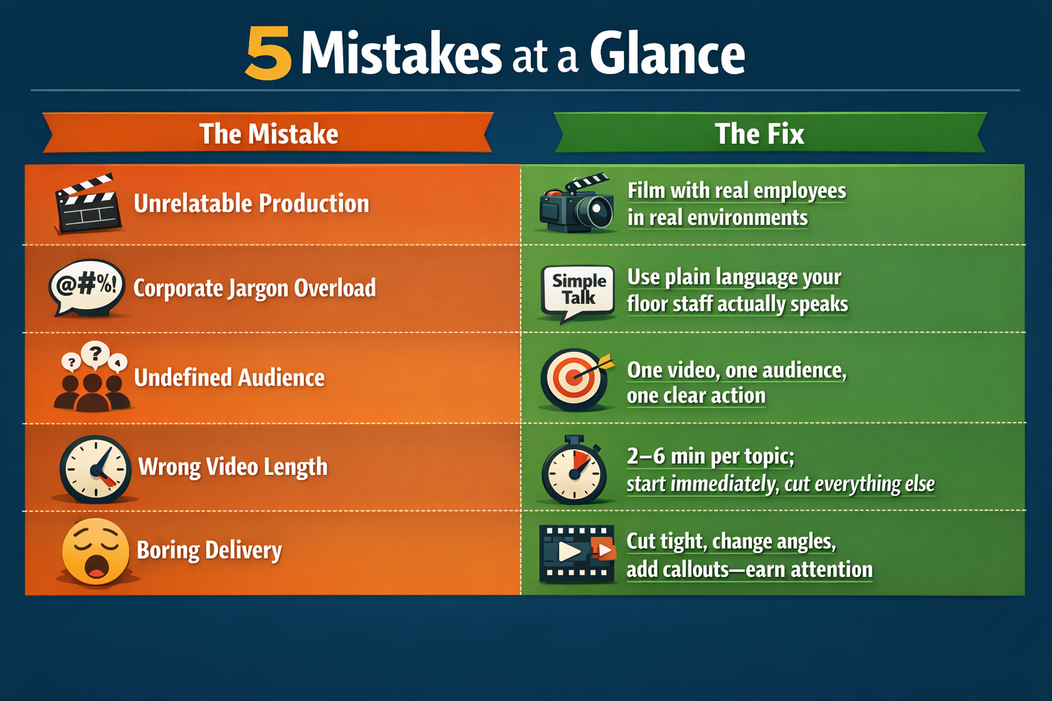 The fix: Cut the intro formalities. Skip the "Welcome to XYZ Company's official training program for..." No one is watching that. Get to the point in the first five seconds, and stay there. Cut dead space ruthlessly. Your associates' attention is a finite resource — treat it that way.